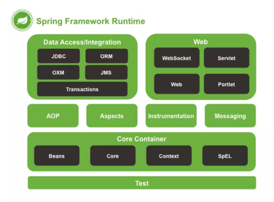 Spring 总共大约有 20 个模块, 由 1300 多个不同的文件构成。 而这些组件被分别整合在核心容器(Core Container) 、 AOP(Aspect Oriented Programming)和设备支持(Instrmentation) 、数据访问与集成(Data Access/Integeration) 、 Web、 消息(Messaging) 、 Test等 6 个模块中。 以下是 Spring 5 的模块结构图: